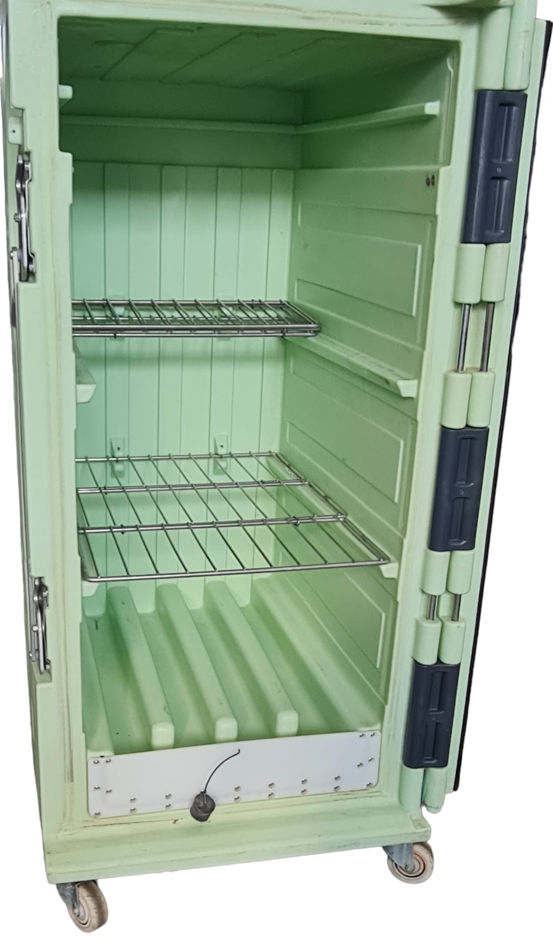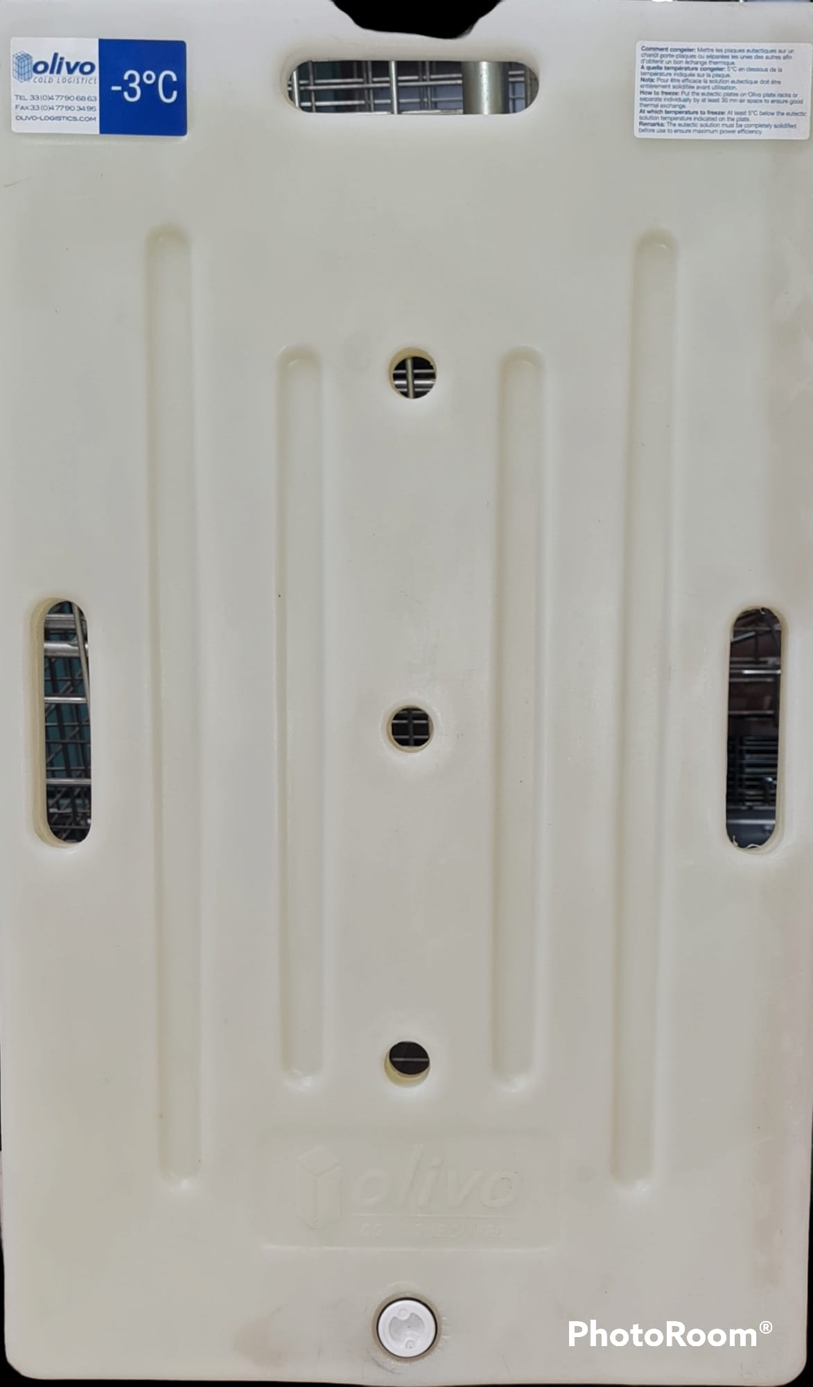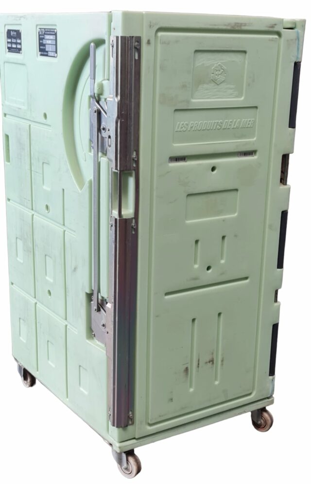 Box isotermico Olivo 670 litri "Produits de la mer", predisposto con raccogligocce per il trasporto di prodotti ittici ma utilizzabile per qualunque tipologia di merce. Può essere dotato di due griglie inox ripieghevoli per il minimo ingombro e di una o due piastre eutettiche da -3 oppure -21°C, non incluse ma fornibili nuove su richiesta.